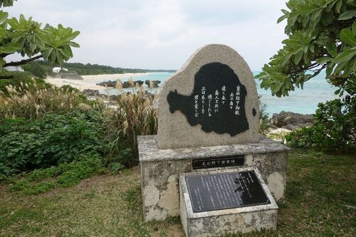 大金久海岸沿いの展望所にあった皇后陛下御歌碑 その後も島の東側の海岸線を南下します。 一昨日の夕方に来て雑草の生えた道路しか見当たらなかったので見るのを諦めていた赤崎灯台に再度チャレンジ。 みごと辿り着くことができましたけど、無人の灯台がぽつ…